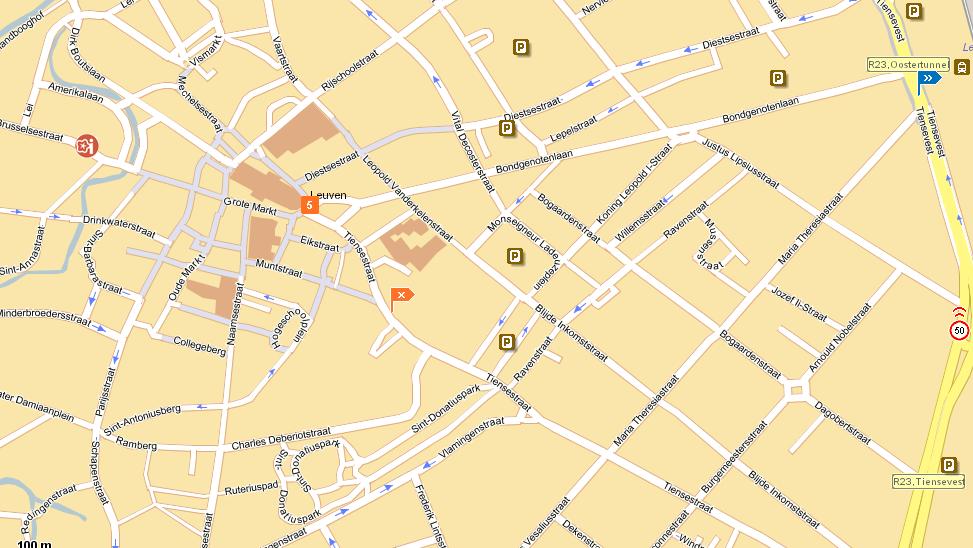 The best way to get around the centre of Leuven is by foot, as the centre is very small and driving is a nightmare. If you come by train, you arrive at Leuven train station, which is on the Martelarenplein. If you need a map, we recommend to use map24. Below is a map of a part of the city centre. The blue flag is the train station, the orange flag is the conference venue.